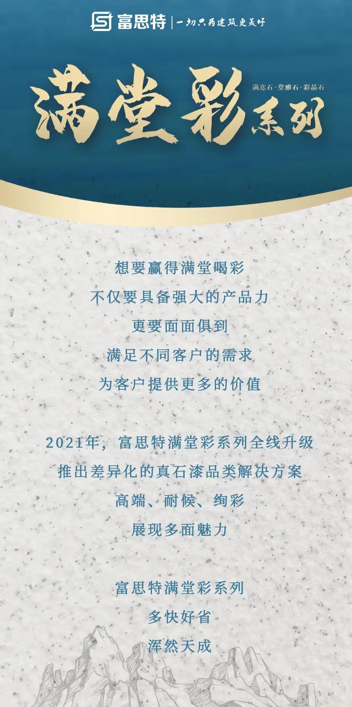 富思特满堂彩系列包含满意石、堂雅石、彩晶石三款系列产品,可为客户提供多种真石漆品类解决方案,满足客户对品质、装饰的不同追求。