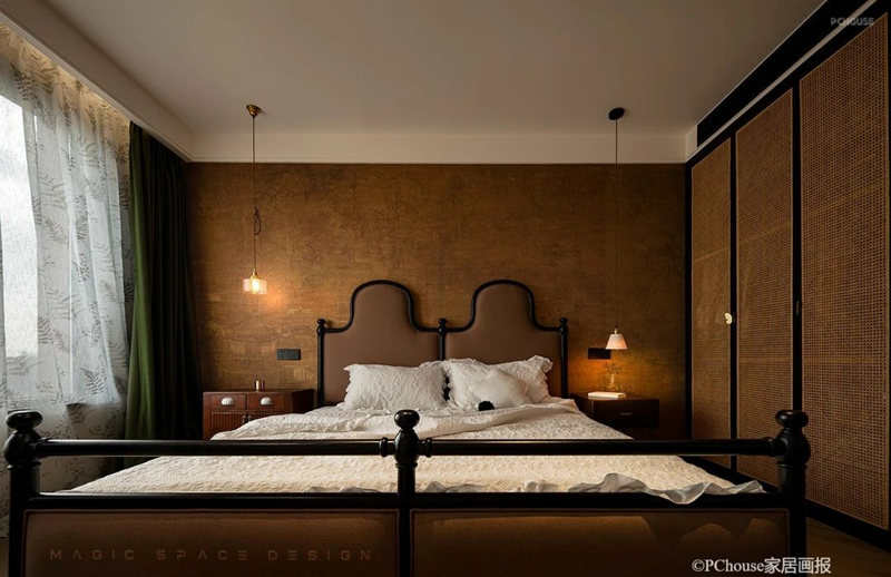 拥用独特氛围感的陈列组合,不锈钢的金属色泽在前,竹节隔断屏风居中,一盏吊灯点亮卧室空间的一角。