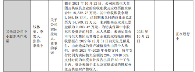 2022年报称,为切实保障中小股东和投资者的利益,董事长钱林弟、董事李忠人、张勇、季歆宇联合承诺:未来如果么司与恒大集团及其成员企业的应收账款和应收票据在 2022 年 12 月 31 日前无法足额兑付,由此造成的资产减值损失由我个人承担,并在 2023 年-2025 年分期支付,每年支付比例为实际损失金额的 20%、30%和 50%,支付时间为年度审计报告出具后 60 个工作日内。