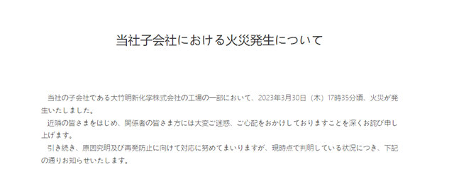 根据中涂化工的调查结果显示,本次火灾发生地点为广岛县大竹市明治新开1号7大竹明新化学株式会社本部工厂化成品制造大楼。2023年3月30日(星期四)17点35分左右,化成品制造楼1楼起火,19点30分消防确认火势已扑灭。目前,该公司一名员工受伤被送往医院,但没有生命危险。关于财产损失现在公司正在调查中。