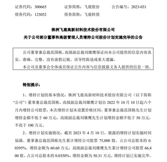 4月13日,飞鹿股份关于公司部分董事和高级管理人员增持公司股份计划实施完毕的公告显示,董事兼总裁范国栋、高级副总裁刘雄鹰增持计划已实施完毕。