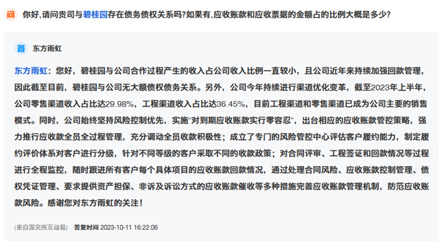 东方雨虹董秘10月11日16:22回复称:碧桂园与公司合作过程产生的收入占公司收入比例一直较小,且公司近年来持续加强回款管理,因此截至目前,碧桂园与公司无大额债权债务关系。
