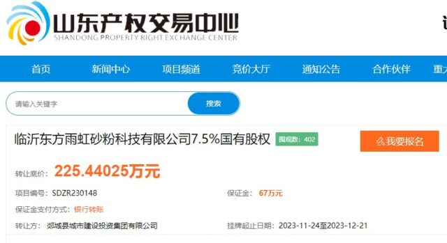 11月24日,一家名叫郯城县城市建设投资集团有限公司的国企以225万元的底价转让临沂东方雨虹砂粉科技有限公司7.5%的国有股权。