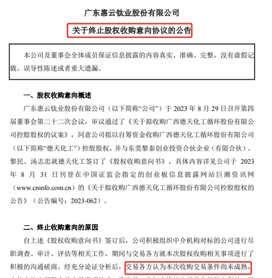 2月28日,惠云钛业发布终止股权收购公告,称经积极沟通磋商,已经终止了对广西德天化工控股权的收购。终止收购的原因是,双方都认为,此次收购交易的条件尚未成熟。