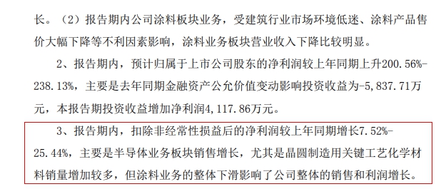 2024年1月18日晚间,上海新阳发布2023年度业绩预告时,就表达了对涂料业务的“不满”:报告期内,扣除非经常性损益后的净利润较上年同期增长7.52%-25.44%,主要是半导体业务板块销售增长,尤其是晶圆制造用关键工艺化学材料销量增加较多,但涂料业务的整体下滑影响了公司整体的销售和利润增长。