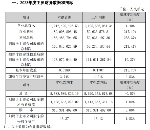 业绩快报显示,上海新阳全年营收12.12亿元,同比增长1.40%;归母净利润1.67亿元,同比增长213.41%,扣除非经常性损益后净利润为1.23亿元,同比增长10.27%。