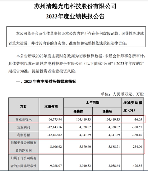清越科技2023年度实现营收6.68亿元,同比下降36.05%,实现归属于母公司所有者的净利润-8,606.62万元,同比下降254.00%。