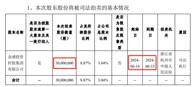 5月13日,金浦钛业发布公告,公司控股股东金浦集团因债务逾期,所持3000万股上市公司股票(占总股本的3.04%),将被法院2024年6月14日-6月15日在淘宝网上公开拍卖。