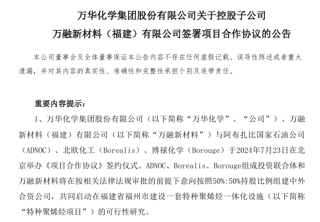 7月23日,中国化工巨头万华化学携子公司万融新材料与中东的土豪朋友阿布扎比国家石油公司牵头的投资联合体在北京签约,拟成立中外合资公司(中外持股比例50%:50%),在福建联手打造160万吨/年的特种聚烯烃项目,以实现航空航天、汽车等领域的关键材料高端聚烯烃的国产化替代。