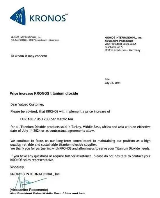 这不,在削弱我国钛白粉出口价格优势的消息传出后,科慕、康诺斯、泛能拓、特诺等大厂纷纷发布涨价通知,自2024年7月1日起执行新价格。