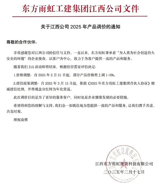 狸巢家居注意到,这份落款印章为江西东方雨虹建筑科技有限公司的涨价函,除宣布自2025年2月21日起,部分产品价格将上调1-5%外,还对授信政策进行调整称,自2025年3月15日起,依据《2025年东方雨虹工建集团合伙人协议》缩减授信比例,并将现金分红转为年化货返。