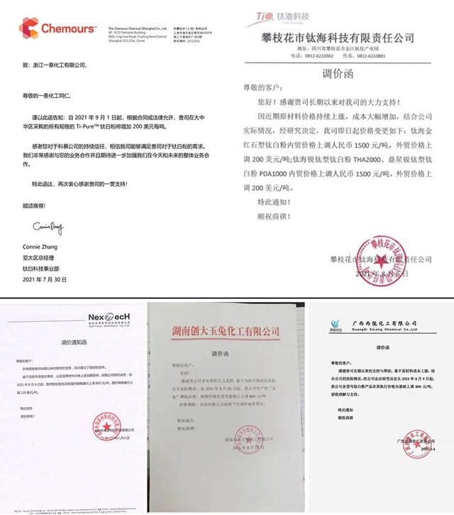 2021年1月11日国内、国际客户分别上调500元/吨和100美元/吨;2月9日分别上调1000元/吨和150美元/吨;3月3日分别上调1000元/吨和180美元/吨;4月6日分别上调1000元/吨和150美元/吨;5月6日分别上调1000元/吨和150美元/吨。以及8月11日再次上调1000元人民币/吨和200美元/吨。