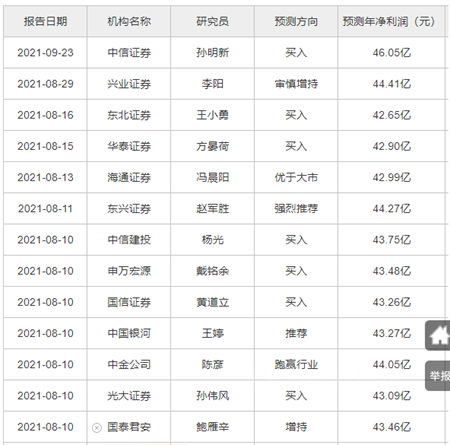截止到2021年9月23日,6个月内共有32家机构对东方雨虹的2021年度业绩做出预测,预测2021年净利润43.46亿元,较去年同比增长28.25%。其中,19家机构“买入”,4家机构“推荐”,3家机构“增持”,2家机构“强烈推荐”,1家机构“跑赢行业”,1家机构“审慎增持”,1家机构“优于大市”,1家机构“强推”。目标价格最高预测78.40元,最低预测62.65元,平均为69.04元。(狸巢网)