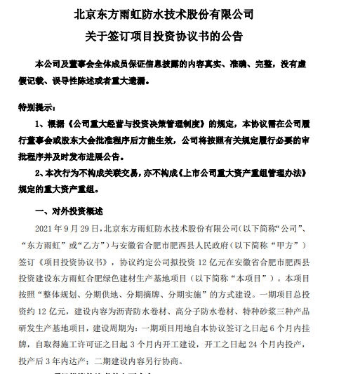 9月29日,北京东方雨虹防水技术股份有限公司(以下简称“公司”、“东方雨虹”)与安徽省合肥市肥西县人民政府签订《项目投资协议书》,协议约定公司拟投资 12 亿元在安徽省合肥市肥西县投资建设东方雨虹合肥绿色建材生产基地项目。