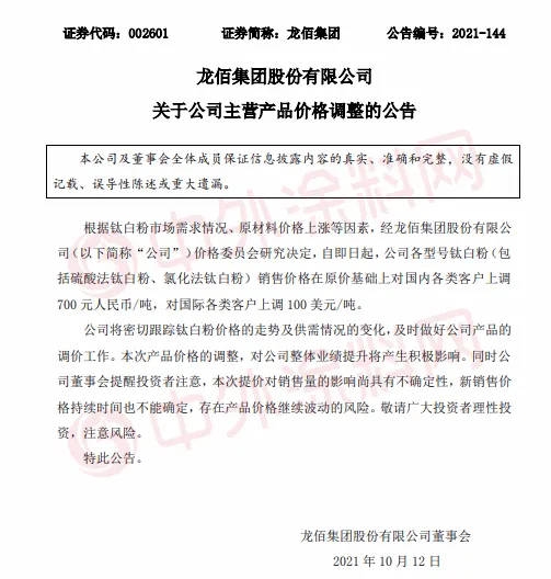 龙佰集团:10月12日起,各型号钛白粉(包括硫酸法钛白粉、氯化法钛白粉)销售价格在原价基础上对国内各类客户上调700元/吨,对国际各类客户上调100美元/吨。