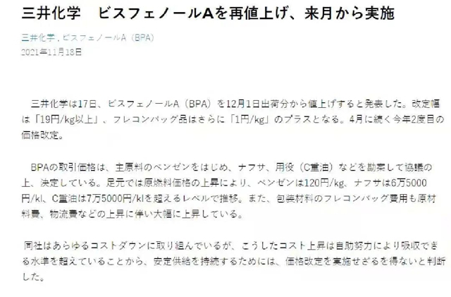 双酚A的售价,涨幅为19日元/吨(约1061元/吨),瓶装的产品额外支付1日元/千克(约58元/吨)的包装费。
