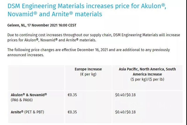 帝斯曼工程材料将提高Akulon®、Novamid®PA6&PA66和®PET&PBT等工程塑料的价格,涨幅均为0.4美元/千克(2551元/吨)此次价格调整将于12月16日起生效,是此前所有涨价通知的补充。