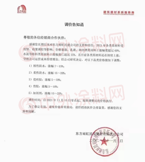 据狸巢网了解,原材料大幅度、长时间的涨价,已超出绝大部分企业的预期及应对能力;此前东方雨虹就分别在2月底、5月中旬和9月初发布了涨价通知,以对冲上游原材料带来的成本压力。此次是东方雨虹第四次提高产品销价。