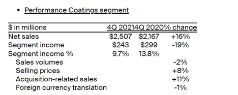 PPG 董事长兼首席执行官Michael H. McGarry评论第四季度业绩时说道:“由于市场对我们产品的需求依然强劲,并且我们继续迅速提高销售价格,因此我们的销售额高于最初的预期。我们的季度销售额创下了以往任何第四季度的纪录,这得益于收购相关的销售额,以及我们几个终端市场的高于市场的销量表现,包括汽车翻新、船舶和PPG-Comex建筑涂料。去年第四季度的业绩包括建筑涂料diy需求的上升,以及与疫情初步复苏相关的全球工业活动的增加。”