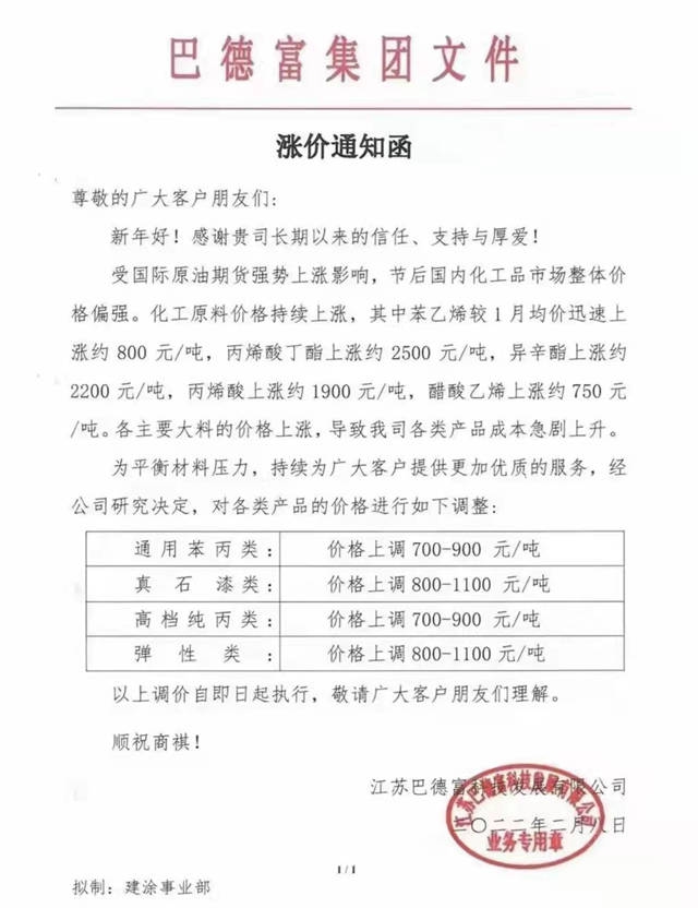 而在恒和永盛发布涨价函之前的2月8日,国内最大的乳液制造商巴德富发布涨价通知函称:受国际原油期货强势上涨影响,节后国内化工品市场整体价格偏强。化工原料价格持续上涨,其中苯乙烯较1月均价迅速上涨约800元/吨,丙烯酸丁酯上涨约2500元/吨,异辛酯上涨约2200元/吨,丙烯酸上涨约1900元/吨,醋酸乙烯上涨约750元/吨。各主要大料的价格上涨,导致我司各类产品成本急剧上升。