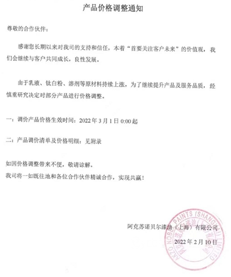 2月10日,阿克苏诺贝尔漆油(上海)有限公司发布《产品价格调整通知》称,由于乳液、钛白粉、溶剂等原材料持续上涨,为了继续提升产品及服务品质,经慎重研究决定对部分产品进行价格调整。调价产品价格生效时间于2022年3月1日0:00起。