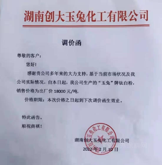 2月10日湖南创大玉兔化工有限公司发布调价函称,基于当前市场状况及我公司实际情况,自本日起,我公司生产的“玉兔”牌钛白粉,销售价格为出厂价18000元/吨。价格期限:本次价格之日起到下次调价函生效止。