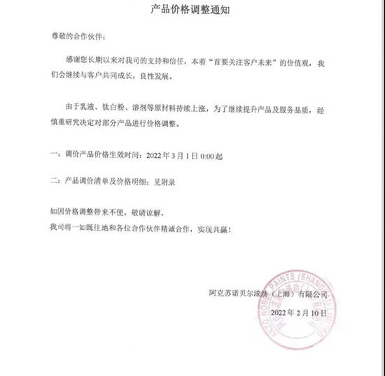 2月10日,阿克苏诺贝尔漆油(上海)有限公司发布产品价格调整通知称,由于乳液、钛白粉、溶剂等原材料持续上涨,为了继续提升产品及服务品质,经慎重研究决定对部分产品进行价格调整。调价产品价格生效时间:2022年3月1日0:00起。