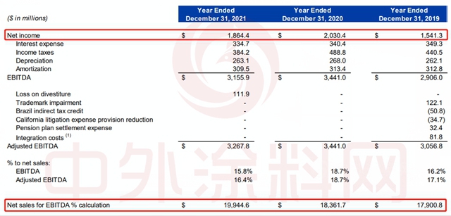 2021年艾仕得顶住原材料上涨、疫情等压力,实现逆势增长。全年营业收入达44.16亿美元,同比增长18.2%;归母净利润为2.64亿美元,较去年同期暴增117.02%。