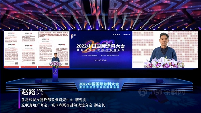国家住房和城乡建设部政策研究中心研究员、全联房地产商会城市更新和既有建筑改造分会副会长赵路兴作《中国房地产转型发展与涂料行业的机遇》主旨演讲。