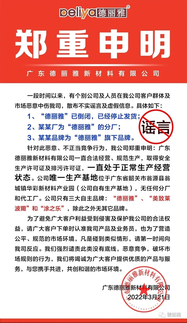 针对此恶意、不正当竞争行为,德丽雅郑重申明:广东德丽雅新材料有限公司一直合法经营、规范生产,取得安全生产许可证及排污许可证,一直处于正常生产经营状态。公司唯一生产基地位于广东省韶关市翁源县翁城镇华彩新材料产业园(公司自有生产基地),无任何分厂和代工厂。公司只有三大自主品牌:“德丽雅”、“美致莱波雨”和“涂之乐”,除此之外无其它品牌。