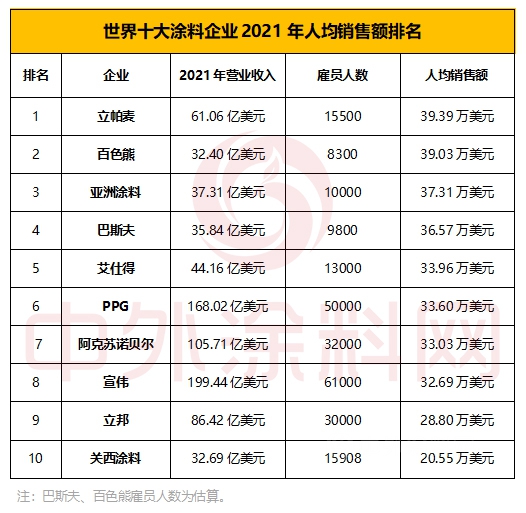 从人均产值来看,立帕麦、百色熊、亚洲涂料位居前三位,分别为39.39万美元、39.03万美元、37.31万美元,平均一人一年销售近40万美元,立帕麦无疑是最牛团队;巴斯夫、艾仕得、PPG、阿克苏诺贝尔、宣伟、立邦、关西涂料分别位居第4-10位。人均营业收入低于30万美元有2家,分别是立邦和关西涂料。