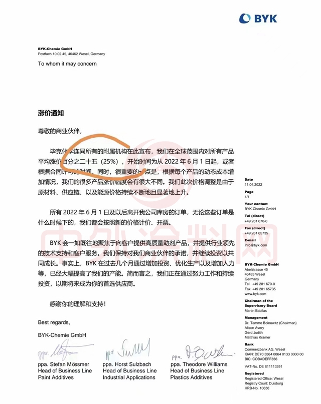 毕克化学:全球助剂巨头毕克化学发布涨价函称,由于原材料、供应链、以及能源价格持续不断地且显著地上升,自6月1日起在全球范围内对所有产品平均涨价25%。