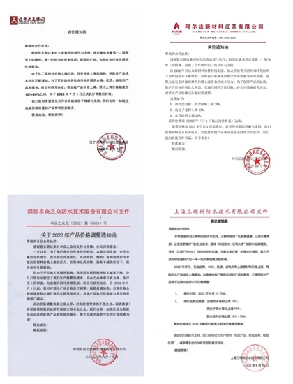 国内唯一一家防水央企北新防水日前也发布调价通知函称,自2022年,国际政治经济局势复杂,各类大宗防水原材料价格持续波动且居高不下,尤其是近期防水产品主要原材料价格飞升,虽然公司已大力推进多项内部优化举措消化成本上升带来的压力,但仍旧无法覆盖成本上升。为能够持续向您提供高品质产品和服务,经公司慎重研究决定:自2022年7月1日起对北新防水产品进行价格调整,涨幅因成本上涨不同略有不同,总体在10%-20%。