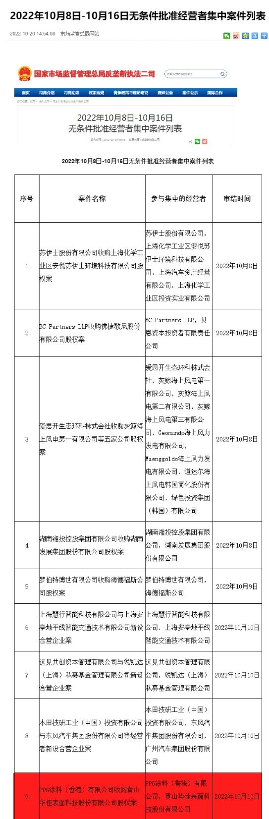直至10月20日,国家市监总局反垄断二司公布了,PPG对黄山华佳的收购通过了反垄断审查,再完成付钱交接才算收购成功。