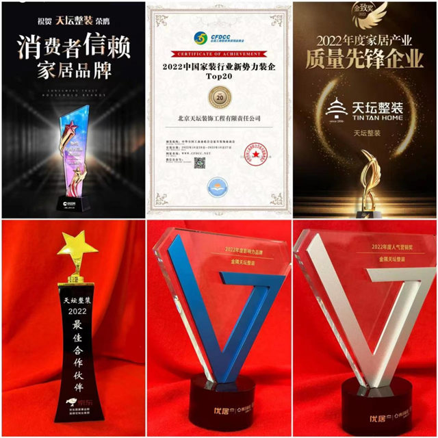 2022年底,天坛整装先后荣获「2022中国家居金致奖」、「2022中国家居产业质量先锋企业」、「2022环球家居甄选·消费者信赖家居品牌」、「2022中国家装新势力装企TOP20」等众多奖项,受到行业内外认可,为天坛家具公司更好的服务用户提振了信心。