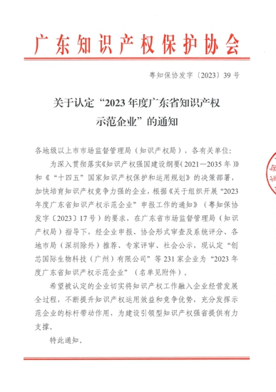 “广东省知识产权示范企业”在科技创新领域具有重要地位,是政府给予企业知识产权管理工作的最高荣誉和评价!代表了该企业是具备知识产权战略管理理念,知识产权创造、运用、保护、管理能力全面发展,知识产权综合竞争优势突出、具有行业影响力和标杆性的示范企业。此次评选工作经企业申报、协会形式审查、系统评分及所在地市局推荐,并由评审专家组结合总体评定规模、地区平衡等因素进行综合评审,最终仅有231家企业入选“2023年度广东省知识产权示范企业”。