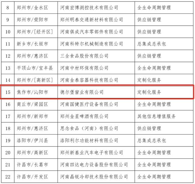 4月29日,河南省工业和信息化厅发布了《2024年河南省服务型制造示范企业(平台)拟确定名单公示》,德尔堡窗业有限公司凭借卓越的创新能力和突出的定制化服务顺利通过评审!
