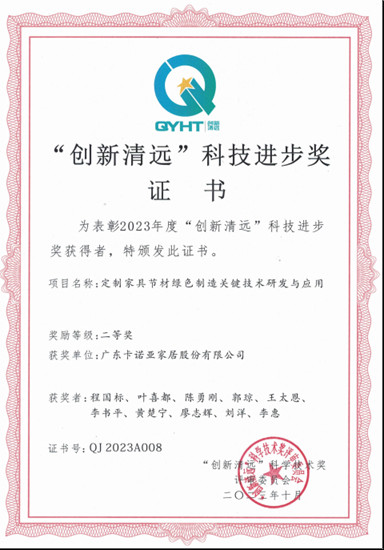 近日,“创新清远”科学技术奖评审委员会公布了2023年“创新清远”科技进步奖获奖名单,卡诺亚家居研究项目《定制家具节材绿色制造关键技术研发与应用》,荣获“创新清远”科技进步奖二等奖。卡诺亚获此证书,一方面,充分说明企业节材绿色制造技术水平在行业的领先地位;另一方面,一直由科研单位、高校主导的技术发展领域中,卡诺亚也正发挥着推动技术革新、应用推广的重要作用。