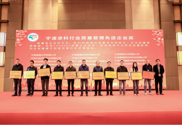 宁波市市场监督管理局质量处处长戴基钢为“宁波涂料行业质量管理先进企业”颁奖