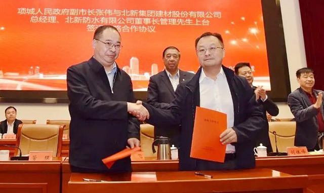 △北新建材总经理管理(右)与项城市副市长张伟(左)签订战略合作协议