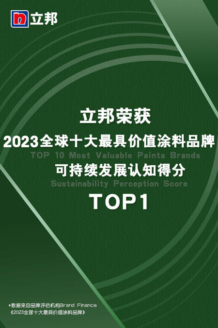 近日,全球知名的品牌评估咨询公司Brand Finance连续第二年发布了“2023年全球十大最具价值涂料品牌”榜单,立邦依托全球优势资源和强劲综合实力再次稳居前三[1],为行业高质量发展提供范本。值得一提的是,在此次评估中,立邦的可持续发展认知得分(Sustainability Perceptions Score)位居第一位,有力印证了立邦对可持续发展的坚定承诺。