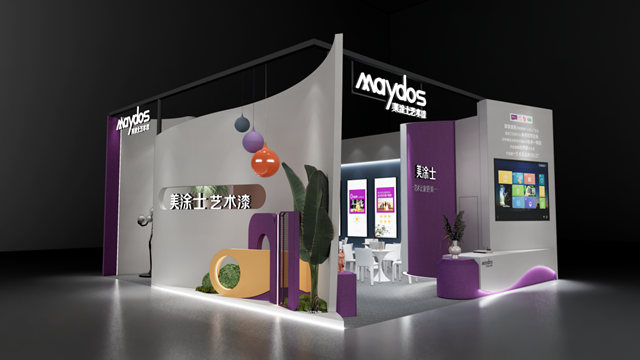 本次展会沿用“方寸之间,让家更美”的展馆设计,融合了品牌的标准色——美涂士紫,并以温柔而优雅的丁香灰为主色,时尚简约而不失活力!再以日晷黄、玛奇朵焦糖色、夏日之歌蓝等为点缀色,采用现代化的展示手法,使用灯光、投影等技术来突出展示的亮点,创造出一个富有东方韵味的艺术空间,给现场观众带来一场视觉盛宴。此外,展馆还会运用产品样板、微水泥梯步景观等元素进行装饰,提高整体的协调性,也更深刻地诠释了美涂士“让世界更环保、更美丽”的企业愿景。