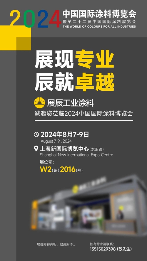 第二十二届中国国际涂料展览会将于2024年8月7日至9日在上海新国际博览中心(龙阳路)举行。作为专业的工业涂料供应商,展辰工业涂料致力于为客户提供优质的工业涂料产品和专业的技术服务支持。现诚邀各位行业精英莅临现场参观指导,共同交流行业动态和发展趋势,期待与您在展会相见!