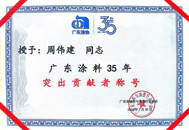 “广东涂料35年突出贡献者称号”