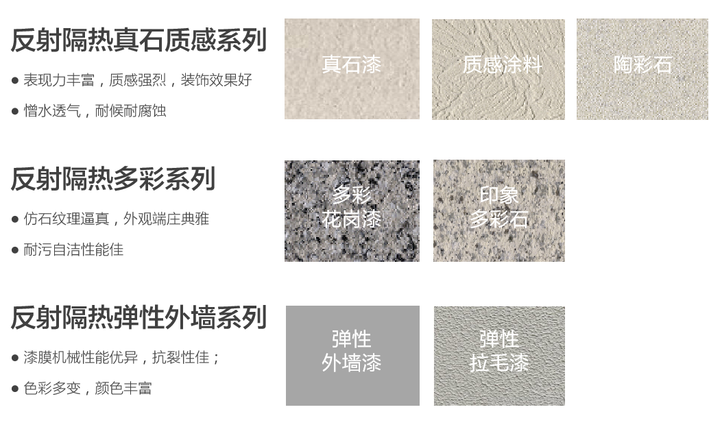 反射隔热真石质感系列、反射隔热多彩系列、反射隔热弹性外墙系列