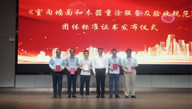 会上,中国涂料工业协会会长刘普军为《室内墙面和木器重涂服务及验收规范》标准起草单位颁发了证书。