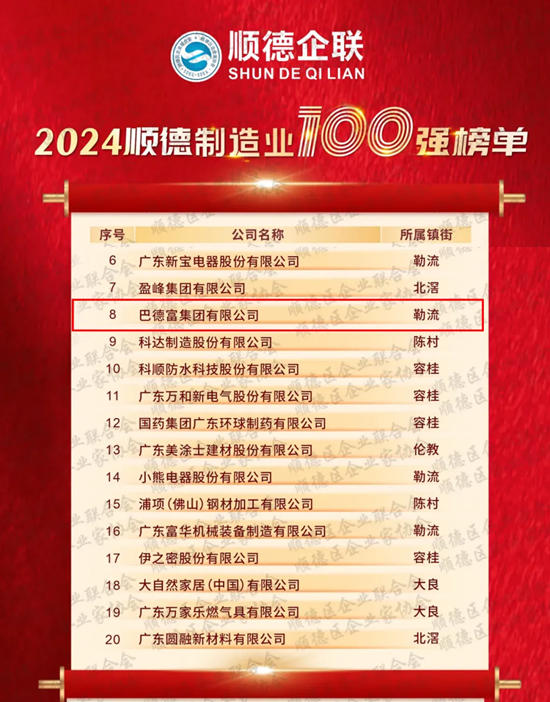 ▲巴德富集团荣获顺德制造业100强榜单第8名