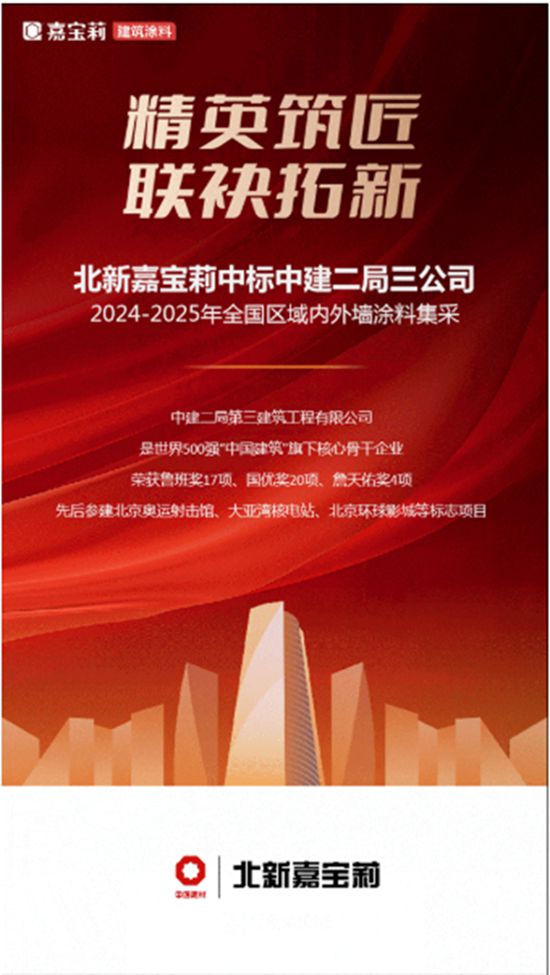 2025开年以来,嘉宝莉以“开局即冲刺”之势,短短3个月内接连斩获华润置地外墙涂料全国独采、中建二局、中铁建系统21家战略框架全品类供应等重磅订单,受到地产界伙伴的高度认可。