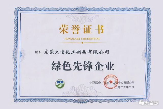 2025年3月20日,在广东珠海举行的中环联合认证中心重点客户交流会上,东莞大宝化工制品有限公司凭借在绿色低碳领域的卓越表现,荣获“绿色先锋企业”称号,彰显了其在可持续发展方面的领先实力。