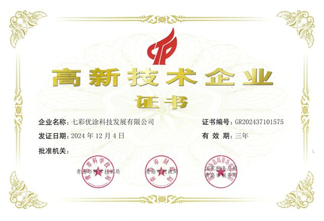 近日, 全国高新技术企业认定管理工作领导小组办公室公布青岛市第二批高新技术企业备案名单,七彩优涂科技凭借领先的技术实力与创新成果,正式通过国家高新技术企业认定,荣获“高新技术企业”证书!